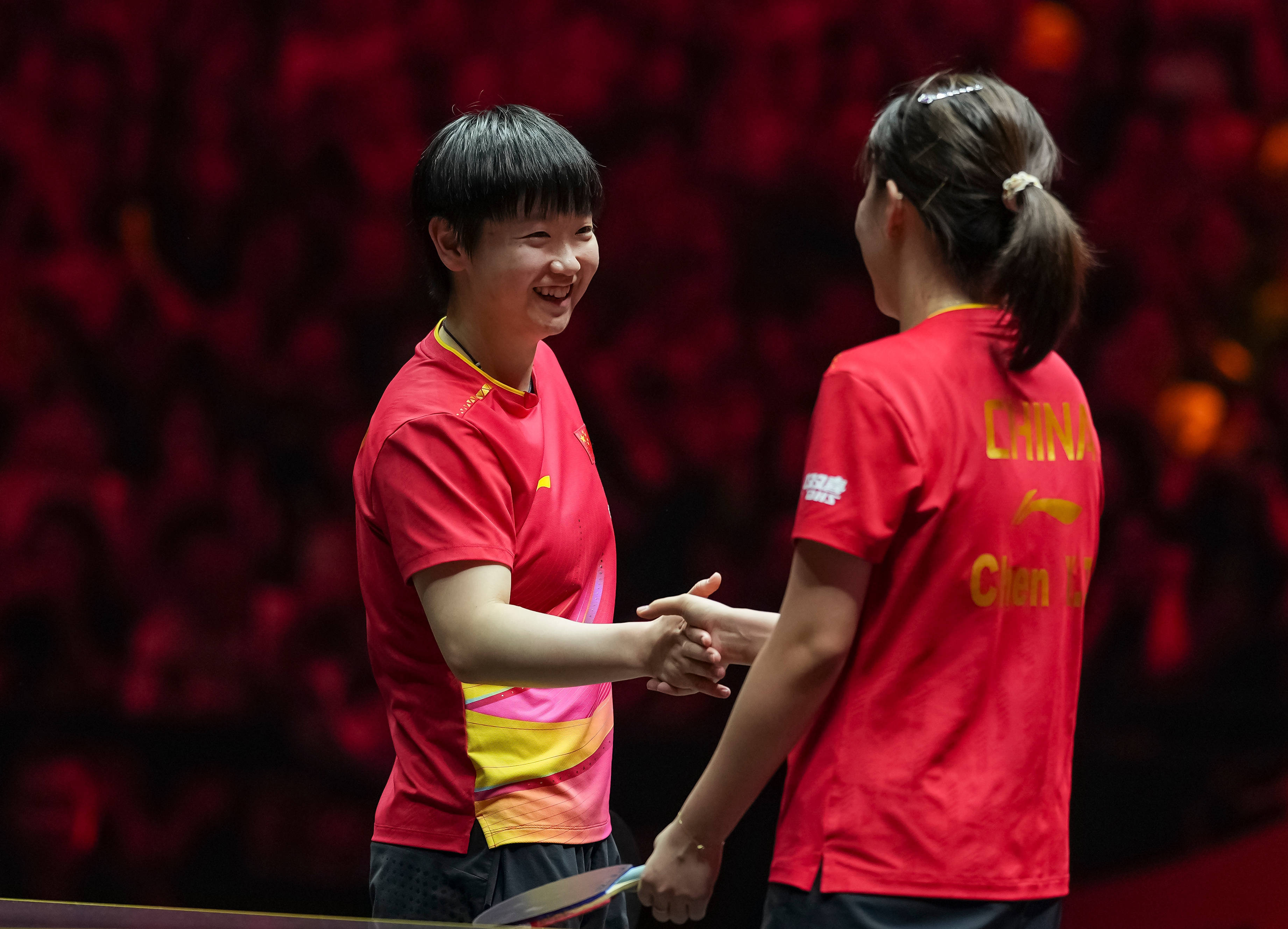 10月4日,孙颖莎(左)与陈幸同在比赛后请安。新华社记者 孙非 摄当日还进行了两场男单四分之一决赛,王楚钦4:1顺服日本选手松岛辉空,半决赛将对阵队友向鹏,后者以4:3力克巴西选手雨果·卡尔德拉诺。