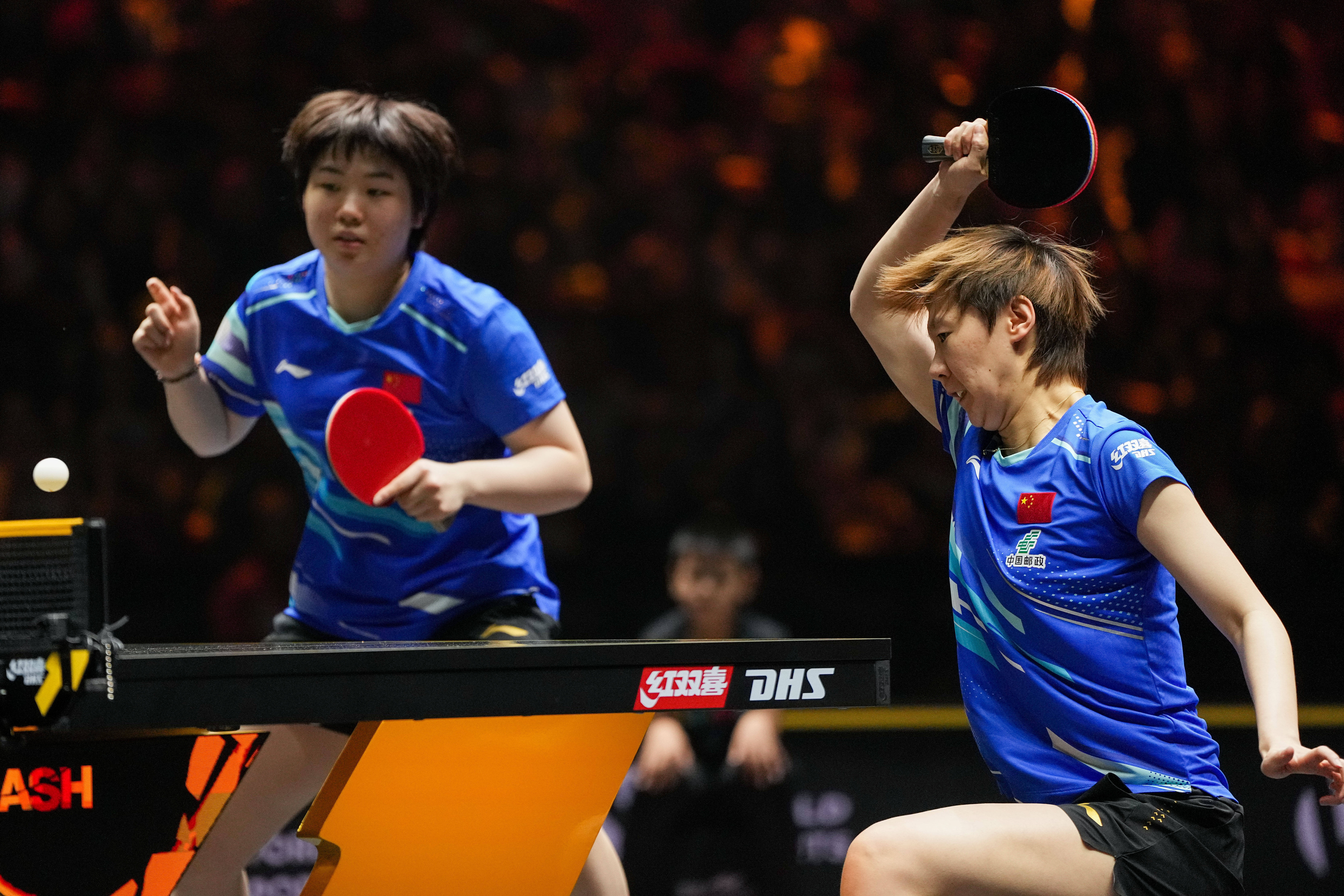当日领先进行的女双决赛中,头号种子王曼昱/蒯曼开局以1:9过期于日本与韩国的跨协会组合早田希娜/朱芊曦,并以6:11输掉第一局。中国队组合随后赶紧进行调养,以11:8、13:11、12:10连扳三局夺冠。