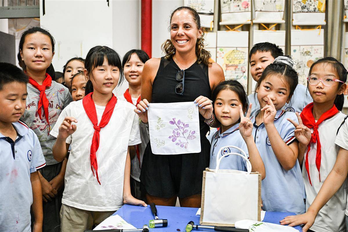10月9日,武网参赛球员朱利亚娜·奥尔莫斯来到武汉市光谷第十七小学,与小学生们亲密互动。