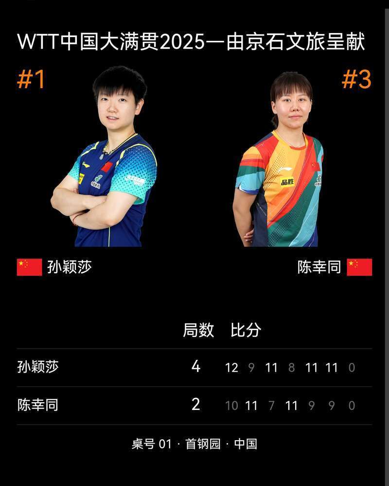 孙颖莎与陈幸同互相十分熟练。从过往交手记载看,孙颖莎以9胜4负占据富余上风,但两东谈主的上一次交手,8月举行的WTT横滨冠军赛女单决赛,陈幸同曾以4:2降服了孙颖莎。
